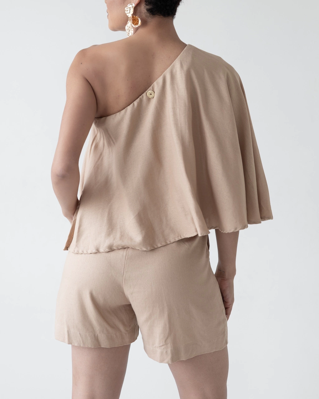 Confeccionado em uma mistura de 70% viscose e 30% linho, o Macacão Curto Ombro Só é leve e confortável, ideal para composições despojadas ou elegantes. Perfeito para ocasiões que pedem um look ousado, feminino e cheio de estilo.